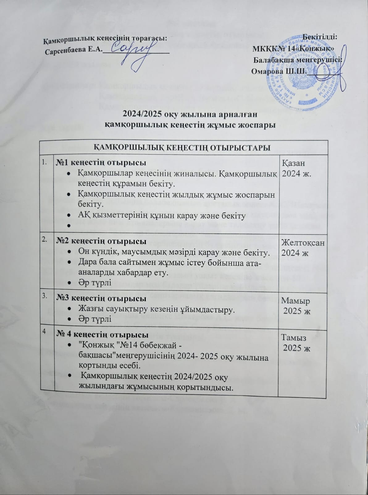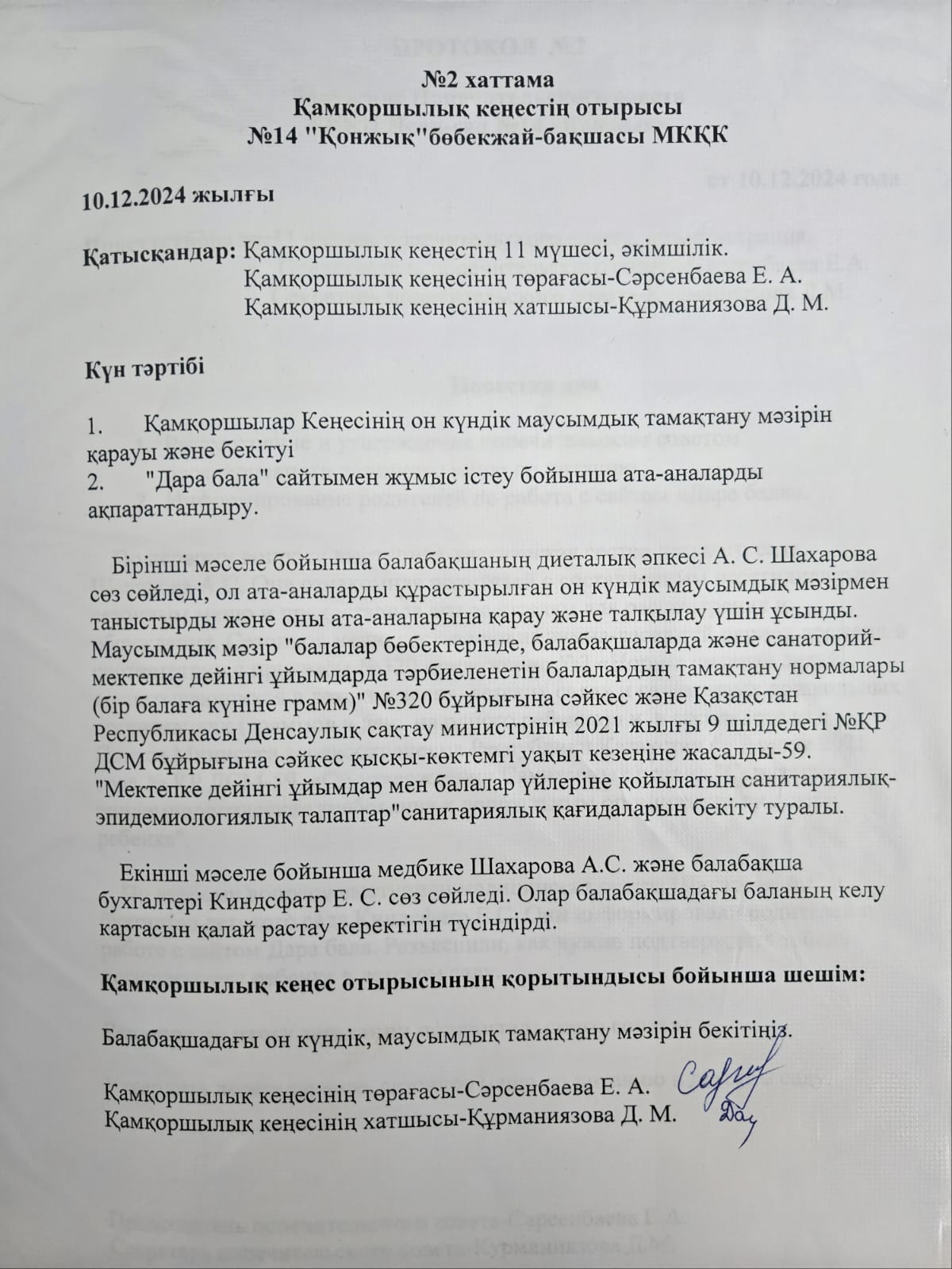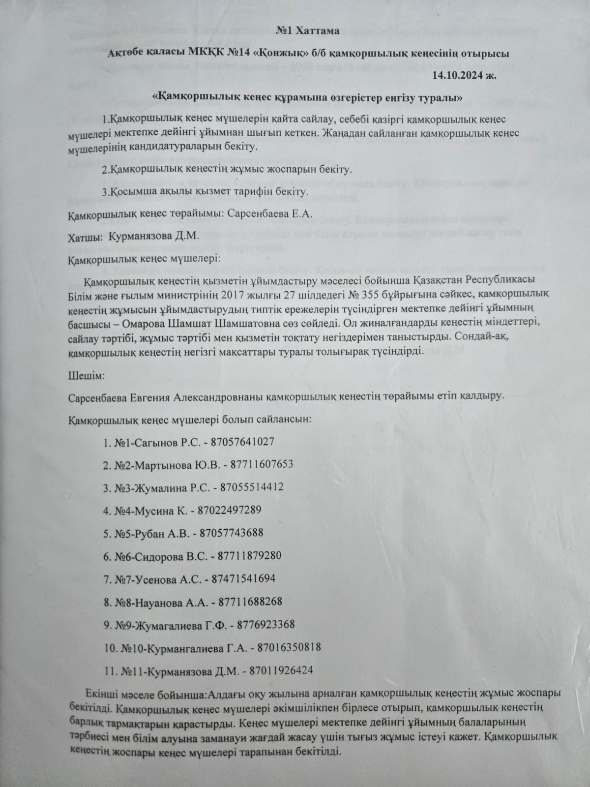 Қазақстан Республикасы Білім және ғылым министрінің 2017 жылғы 27 шілдедегі №355 (білім Министрінің бұйрығымен енгізілген өзгерістерімен 2018 жылғы 2 сәуірдегі №123, КР Оқу-ағарту министрінің м.а. 2023 жылғы 1 наурыздағы № 56 бұйрығы) бұйрығымен бекітілген «Қамқоршылық кеңесінің жұмысын ұйымдастырудың және оны білім беру ұйымдарында сайлау тәртібінің үлгі ережелеріне» сәйкес № 14 "Қонжық" бөбекжай- балабақшасы 2025-2026 оқу жылына қамқоршылық кеңесінің құрылуы және оның құрамы бойынша ұсыныстарды қабылдайтындығы туралы хабарлайды. №14 "Қонжық" бөбекжай-балабақшасы қамқоршылық кеңесінің құрамына үміткерлердің ұсыныстарын қабылдау Ақтөбе қаласы, Астаны ауданы, Т. Рыскулова көшесі, 8 мекен-жайы бойынша жүргізіледі. Электронды мекен-жайы:e-mail: Бұл электронды пошта мекен-жайы спам-боттардан қорғалған. Көру үшін сіздің браузеріңізде JavaScript қосулы тұруы тиіс. байланыс телефоны: 8(7132) 50-95-07 Толық ақпарат мына сілтеме бойынша (https://konzhik.edu.kz/index.php/kk/ata-analar/kenesi)